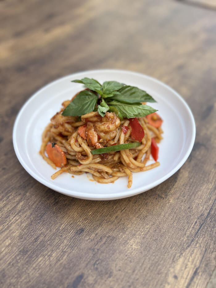 Stir fried fresh flat noodles with egg, onions, bell pepper, carrot, basil and chili paste.