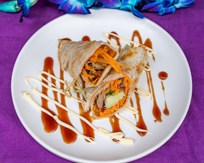 A flavorful wrap featuring crispy duck, cucumber, mint, and carrots, wrapped in Roti bread and finished with a drizzle of delicious mayo and BBQ sauce.