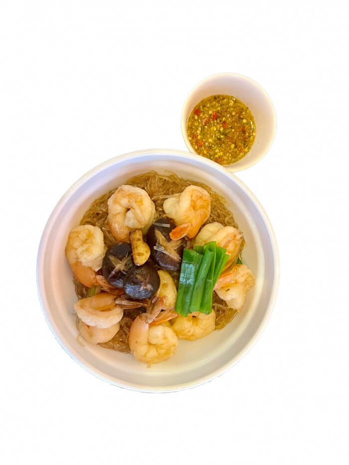 Succulent shrimp, glass noodles, and dried shiitake mushrooms, tossed with fresh ginger, scallions, and a savory house brown sauce, finished with sesame oil and served with spicy seafood sauce on the side.