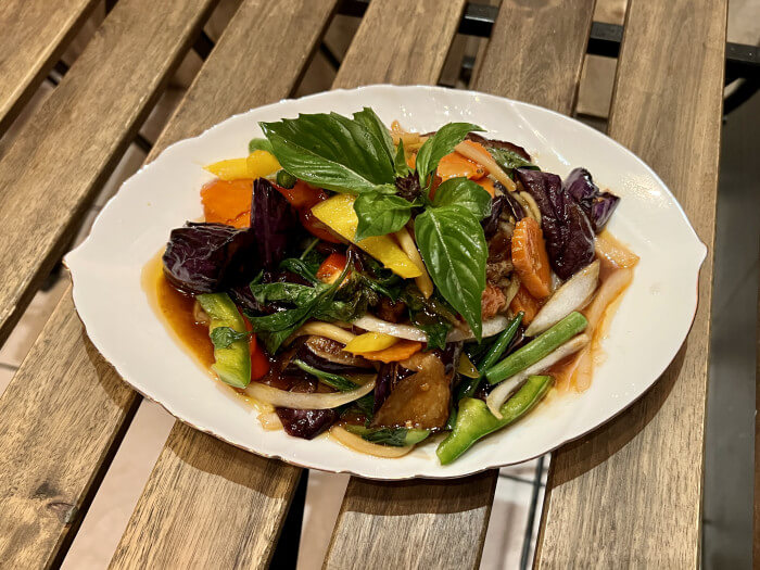 Sauteed eggplant, onion, bamboo shoot, bell pepper in spicy vegan basil sauce.